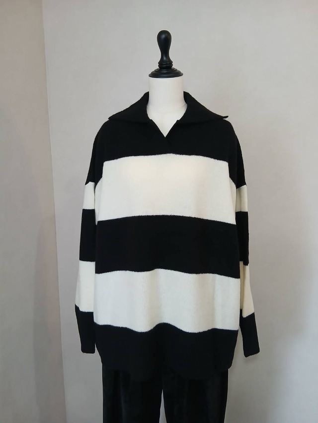 商品品番:R453106 存在感のあるパネルボーダーが目を惹くデザインの ラガーシャツディティールのニット。 ゆとりのあるルーズシルエットに、 ネック部分のスリットで抜け感を出しています。 カジュアルになり過ぎない大人っぽい配色に仕上げました。 QUALIT アクリル 62% ポリエステル 24% ウール 10% ポリウレタン 4% SIZE. 着丈:68cm 身巾:63cm