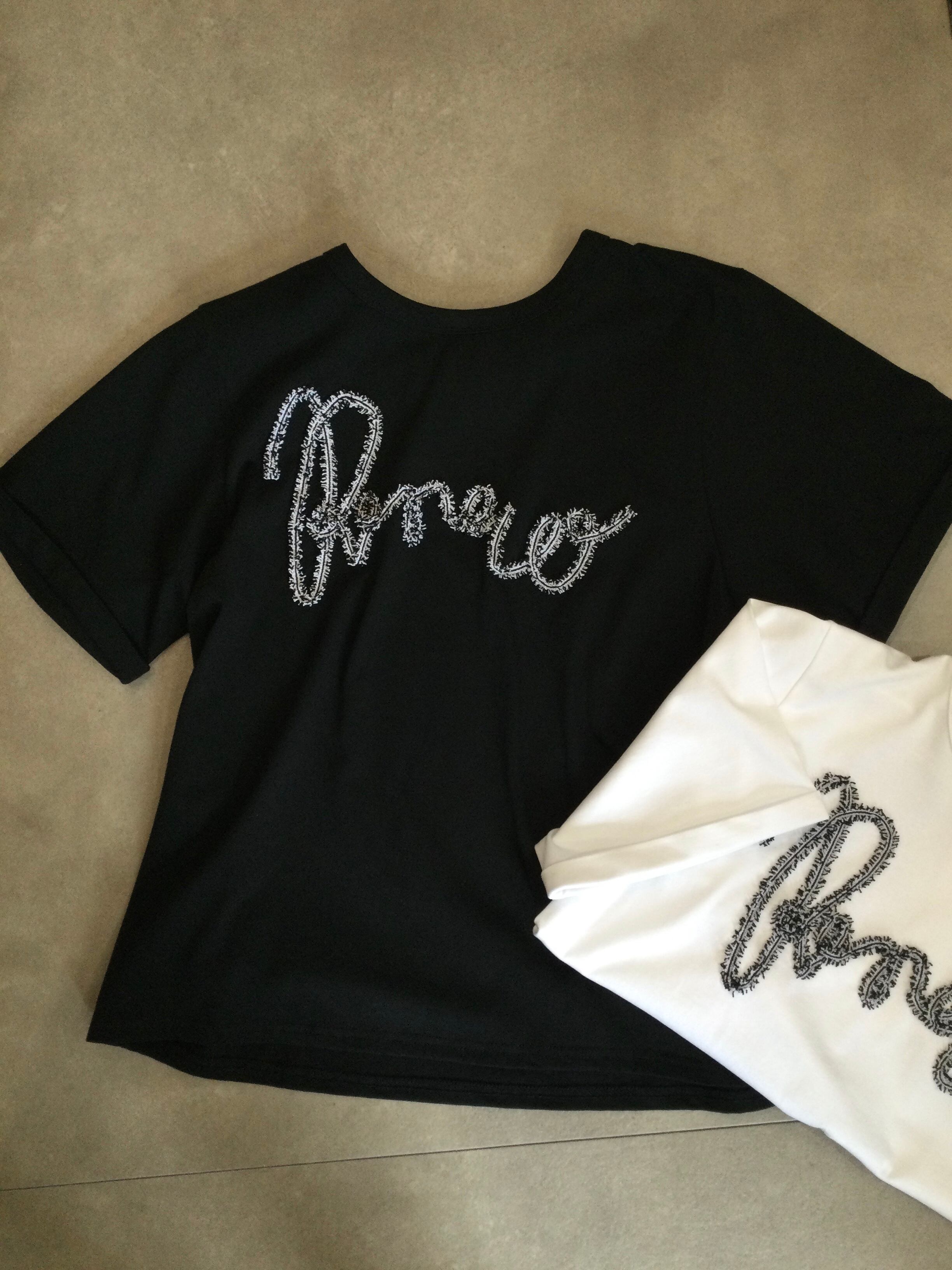 フリンジのテープで「Renew」を施した新鮮なロゴTです。