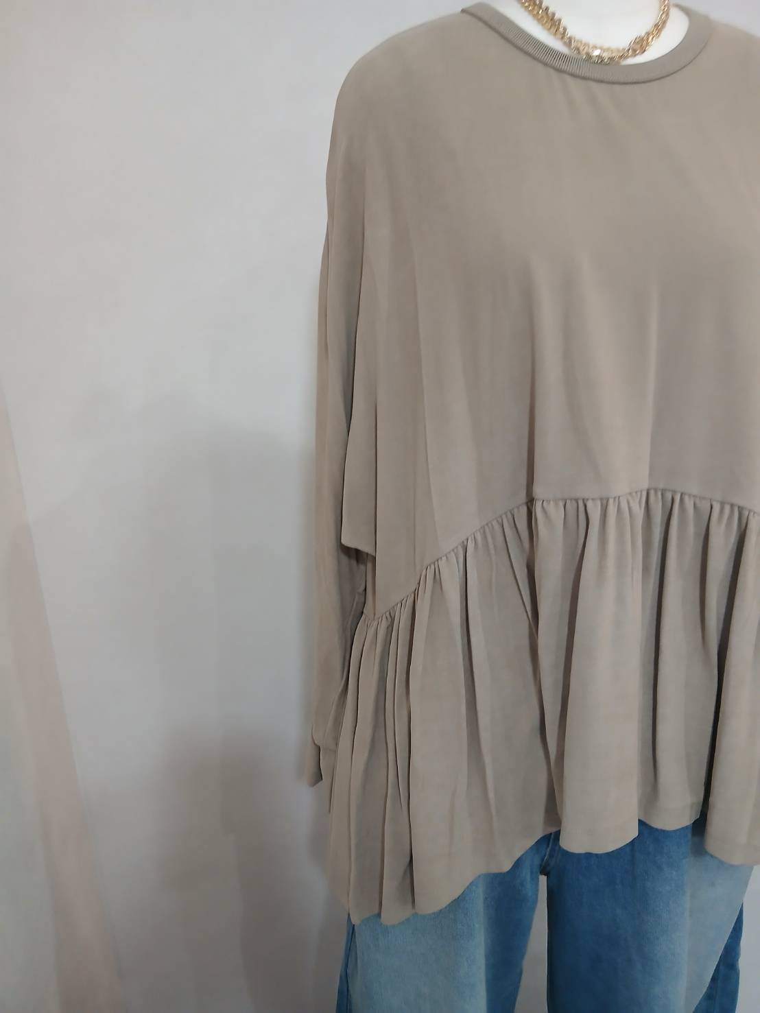ラウンドギャザーが施されており、柔らかい印象を与えつつ、