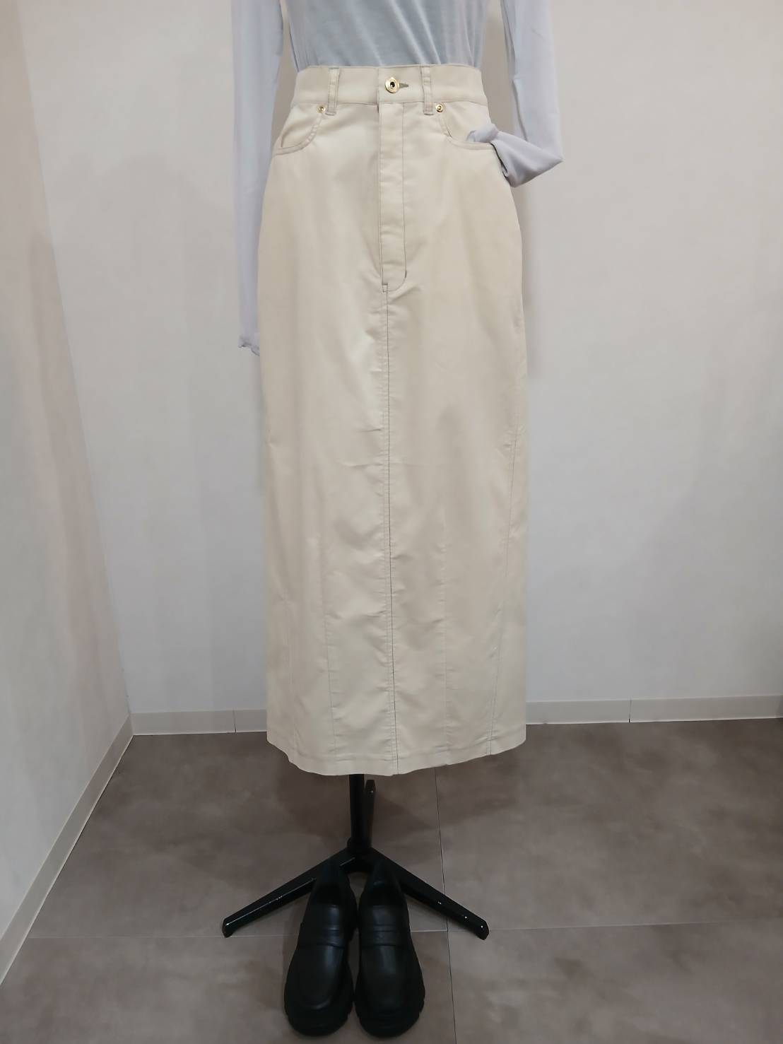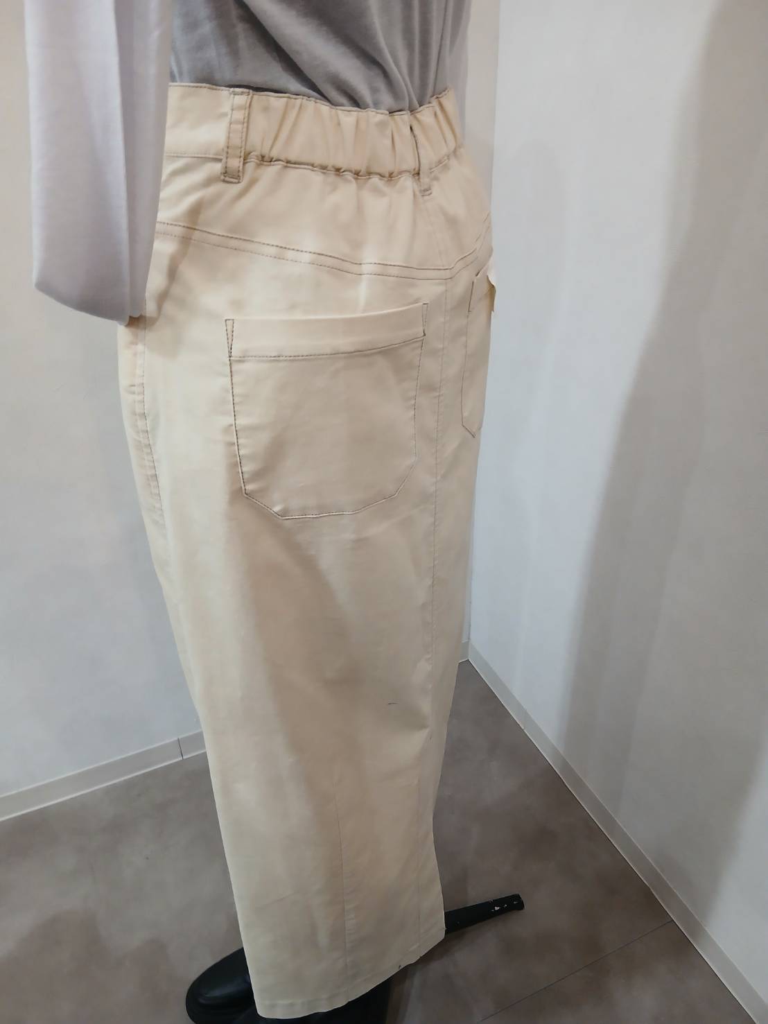 タイトスカートですが、サイドから前に向けて立体的裁断を取っていますので、ややシルエットはゆるい目ですが、細く見える視覚効果もあります。