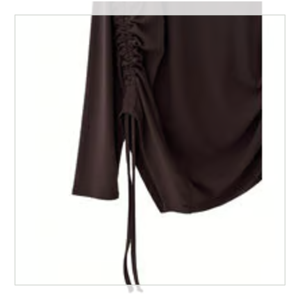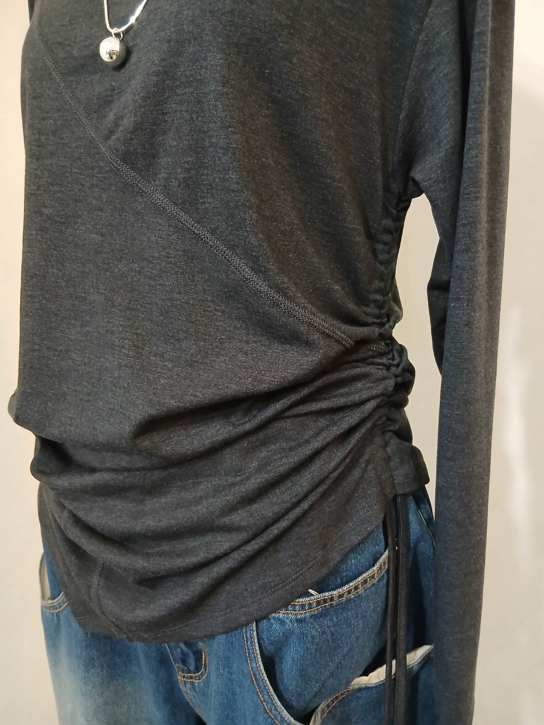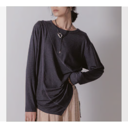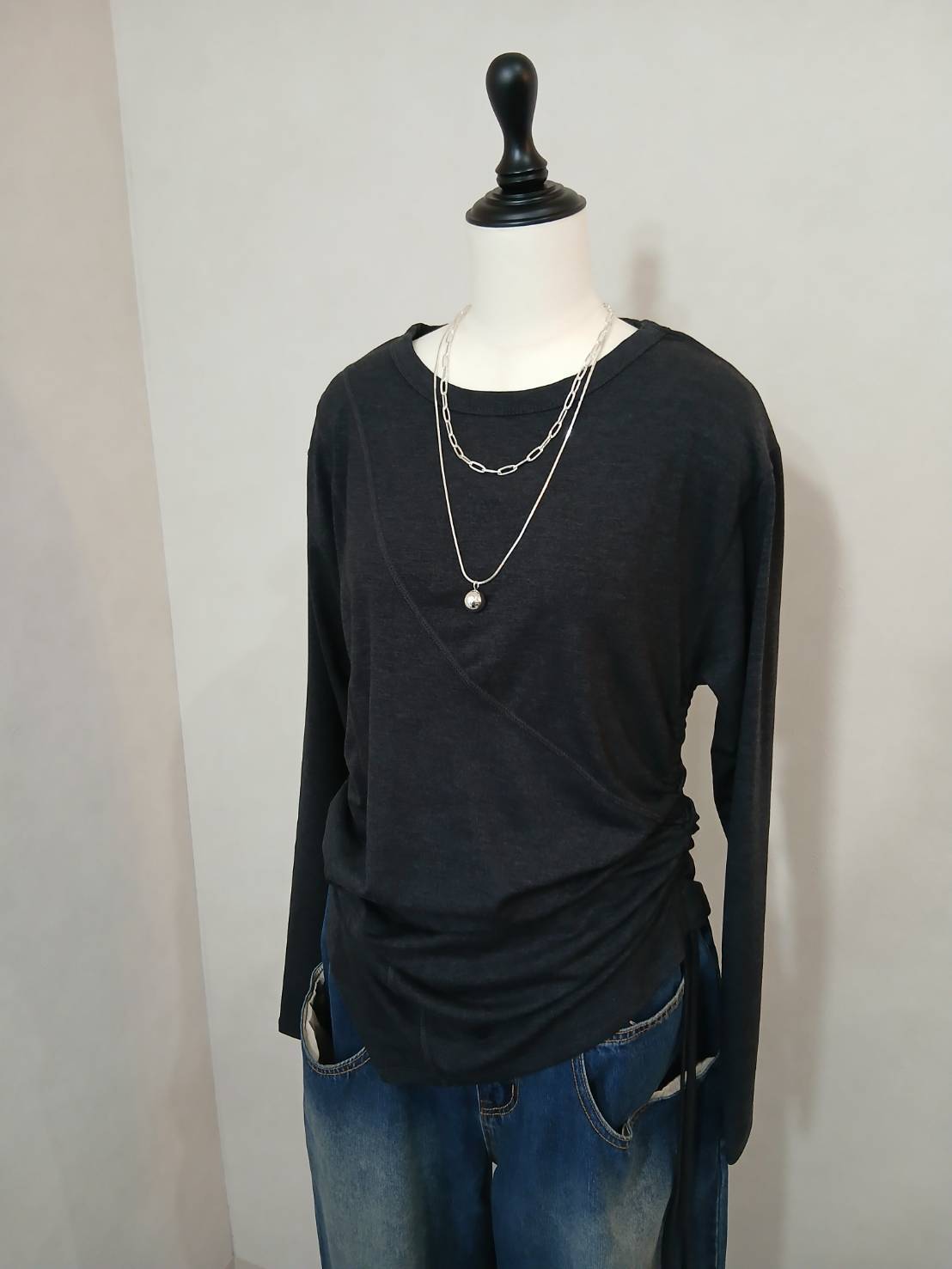 アシンメトリーな切り替えと、両脇のギャザーデザインが