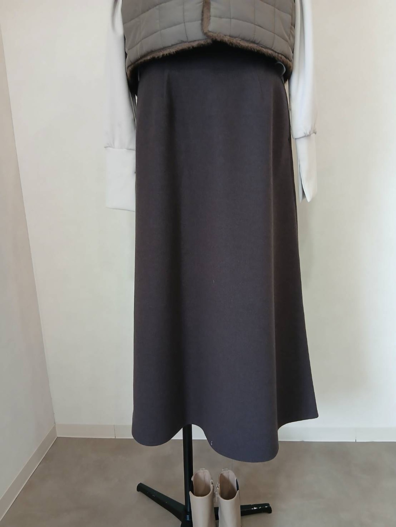 ウールライクのストレッチジャージー生地を使用したフレアスカートです。