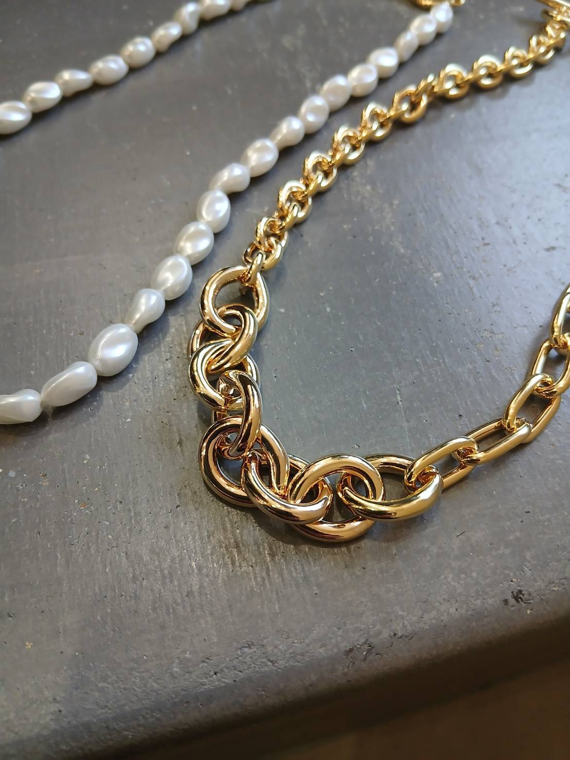 チェーン×パールのコンビネックレス。
