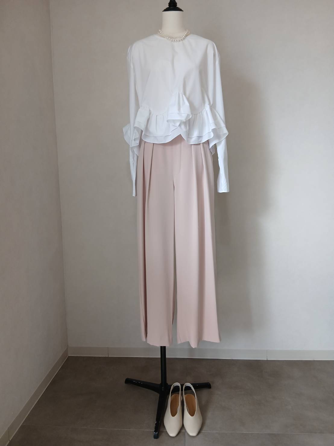 程よく甘さをおさえたデザインで、合わせるトップス次第でキレイめにも