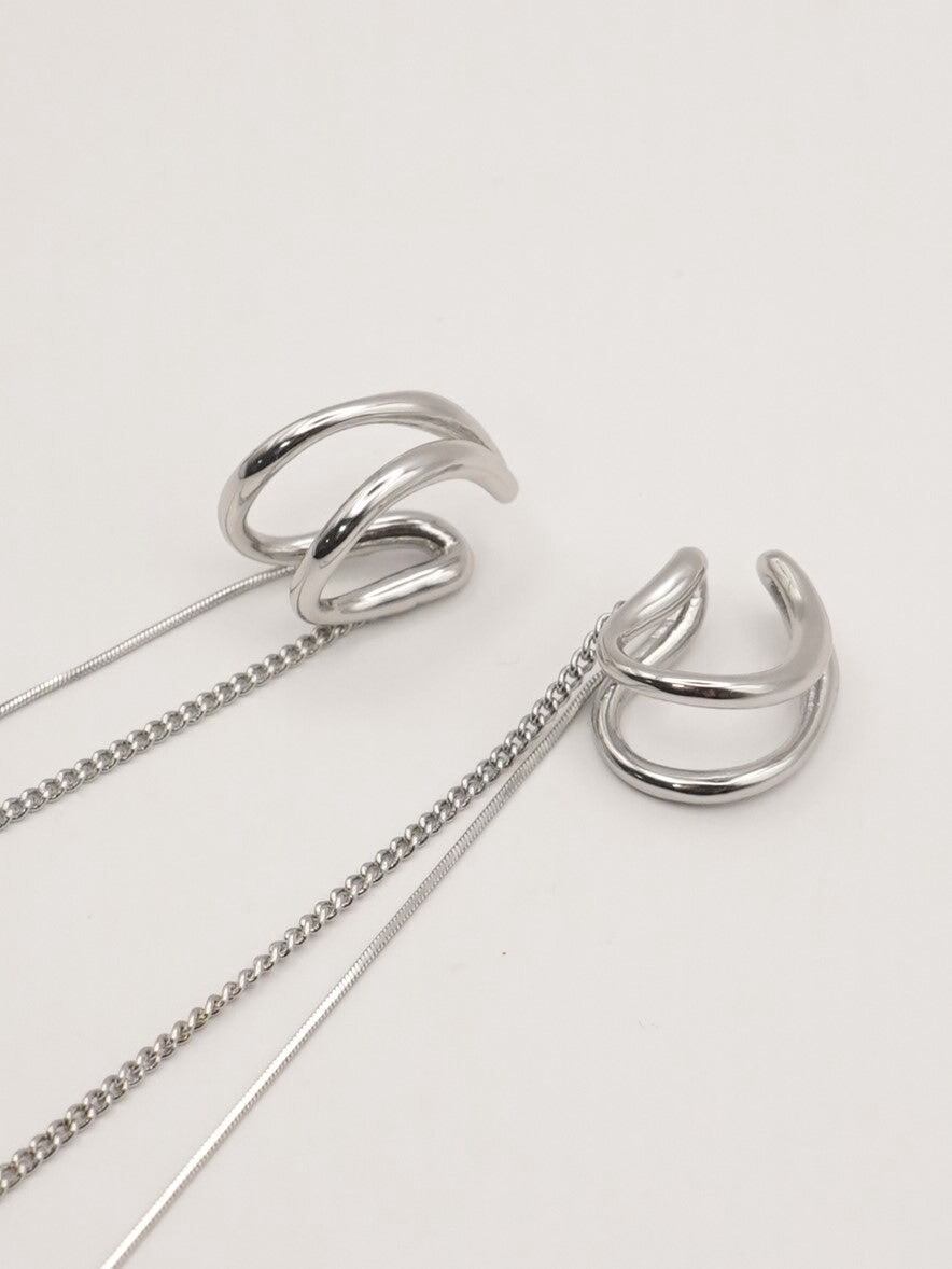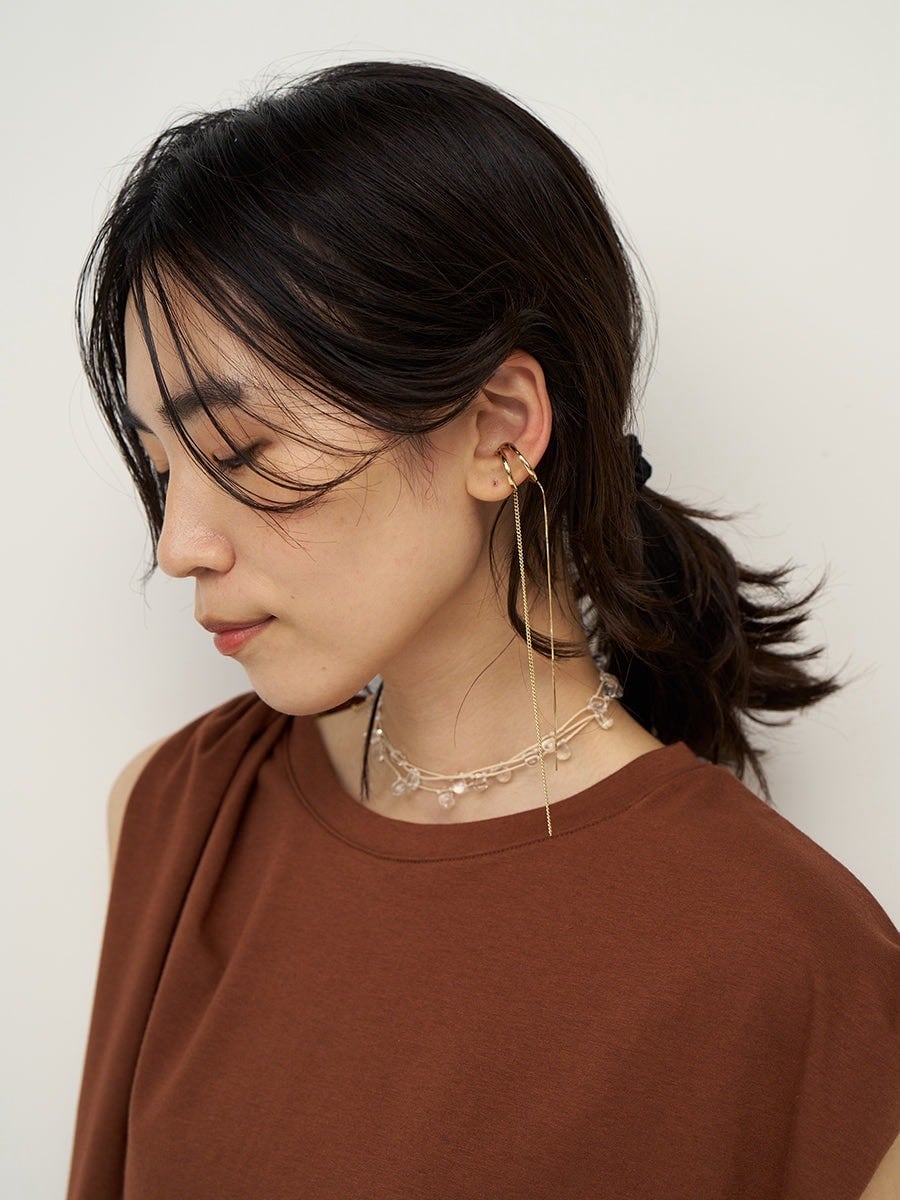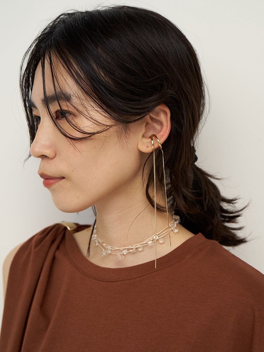 ダブルラインのイヤカフに、きらっと揺れる2種類のロングチェーンが