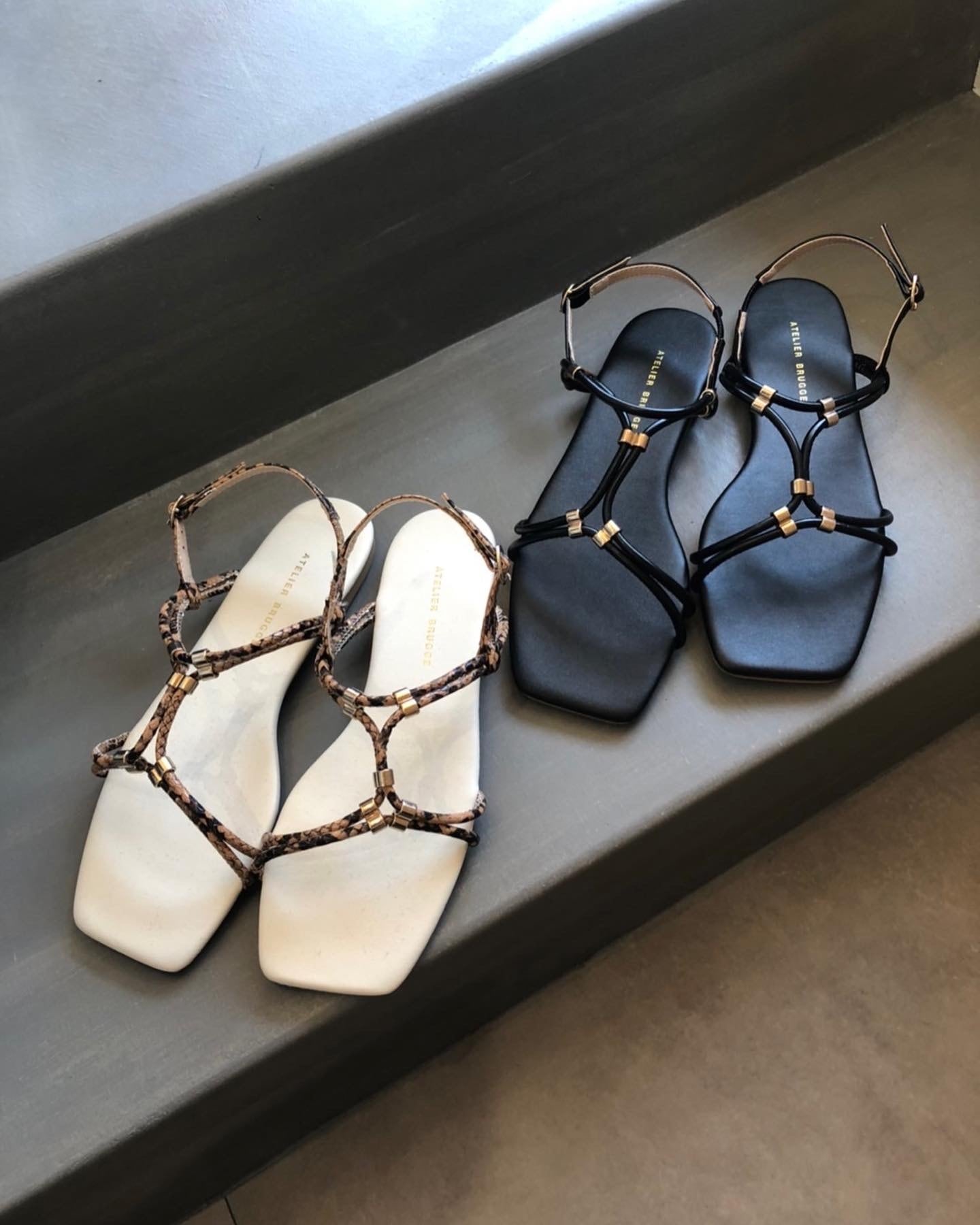 スクエアトゥと華奢なストラップが目を引く一足です。