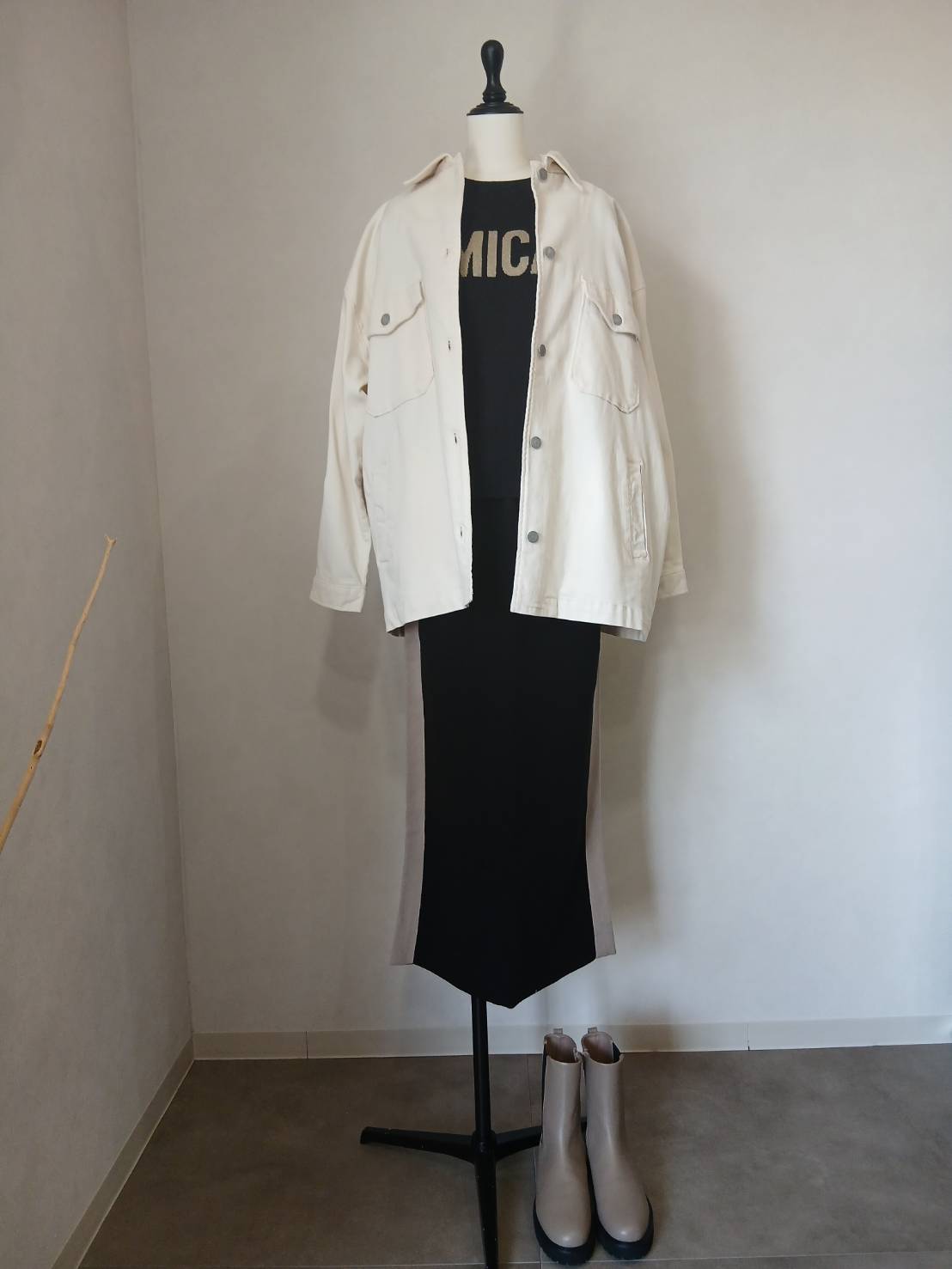 2022awにて展開のチェックシャツジャケットをデニムに落とし込んだデザインになっており、このように上下セットで着用していただく事も可能です。